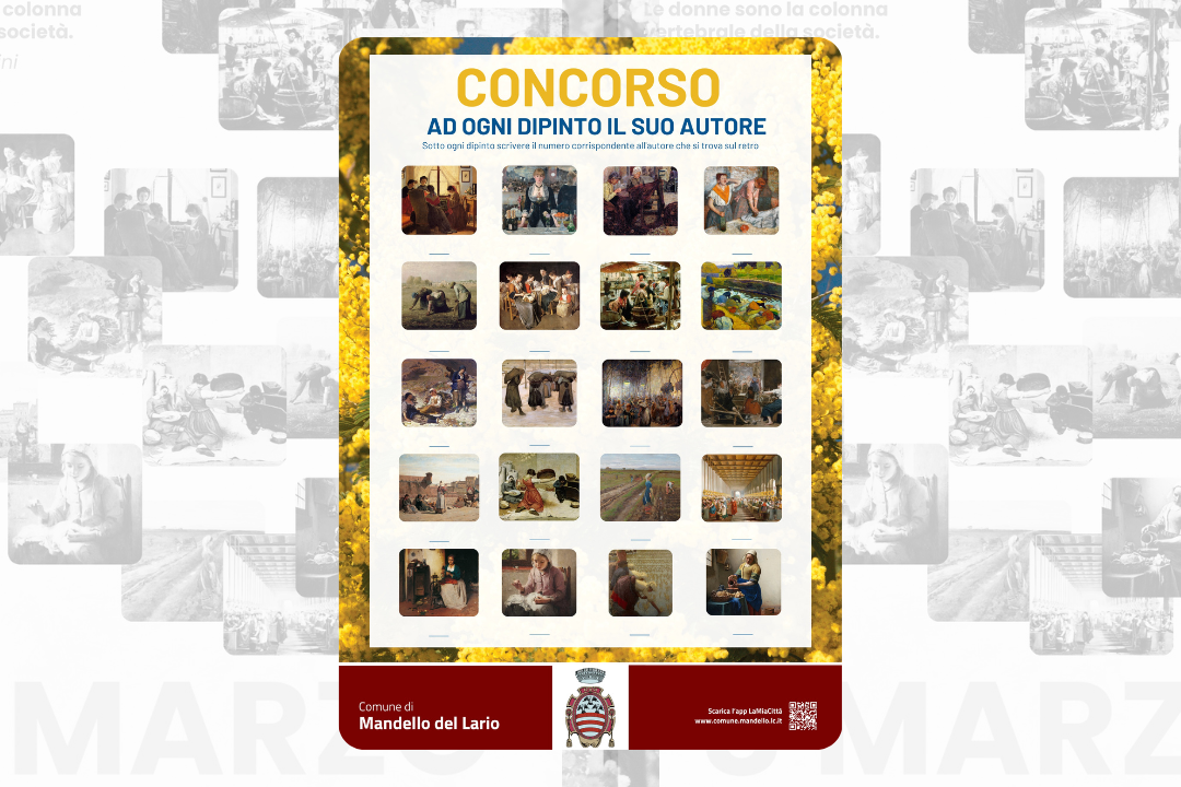 Il Concorso consta nell’indovinare i nomi degli autori dei dipinti raffigurati nella locandina scaricabile nell'allegato sottostante o ritirabile presso gli esercizi del Comune di Mandello del Lario che hanno aderito al Concorso, o presso ufficio protocollo del Comune o alla Biblioteca Comunale