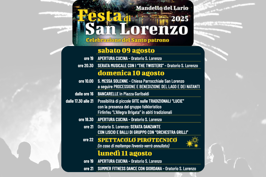 Dal 9 all’11 agosto, l’Oratorio San Lorenzo, in occasione delle celebrazioni del Santo Patrono, ospiterà tre serate di musica e intrattenimento.