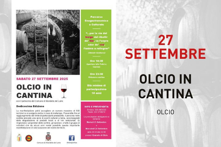 L'Associazione Olciosportiva, con il Patrocinio del Comune di Mandello del Lario, organizza la dodicesima edizione del percorso enogastronomico e culturale Olcio in Cantina, sabato 27 settembre 2025.