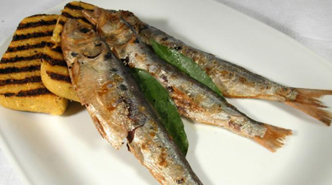 Scottare su una piastra i pesci. Immergerli brevemente in un emulsione composta da due parti di olio e una parte di aceto, con l’aggiunta di un paio di foglie di alloro. Servirli sopra una fetta di polenta abbrustolita.