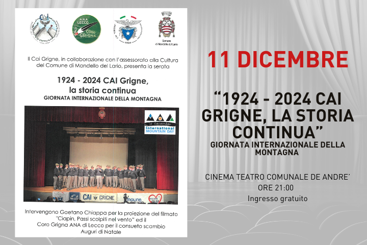 Il Cai Grigne, in collaborazione con l'Assessorato alla Cultura del Comune di Mandello del Lario, presenta la serata "1924 - 2024 CAI Grigne, la storia continua"