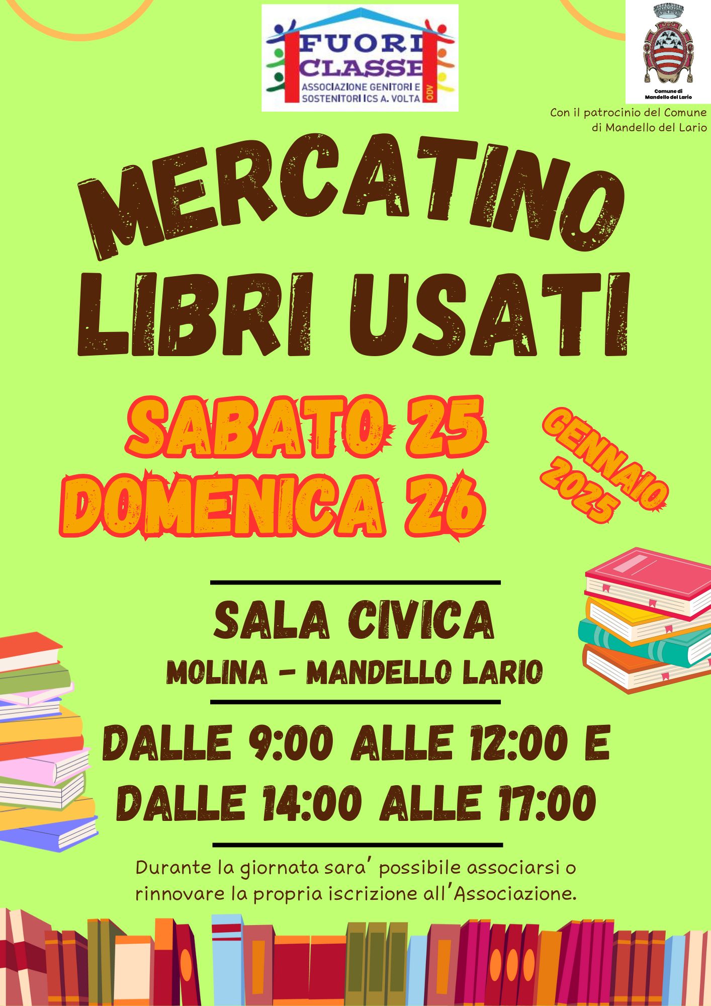 L'Associazione genitori e sostenitori ICS A. Volta Fuoriclasse, con il patrocinio del Comune di Mandello del Lario, organizza il Mercatino dei libri usati presso la Sala Civica a Molina.