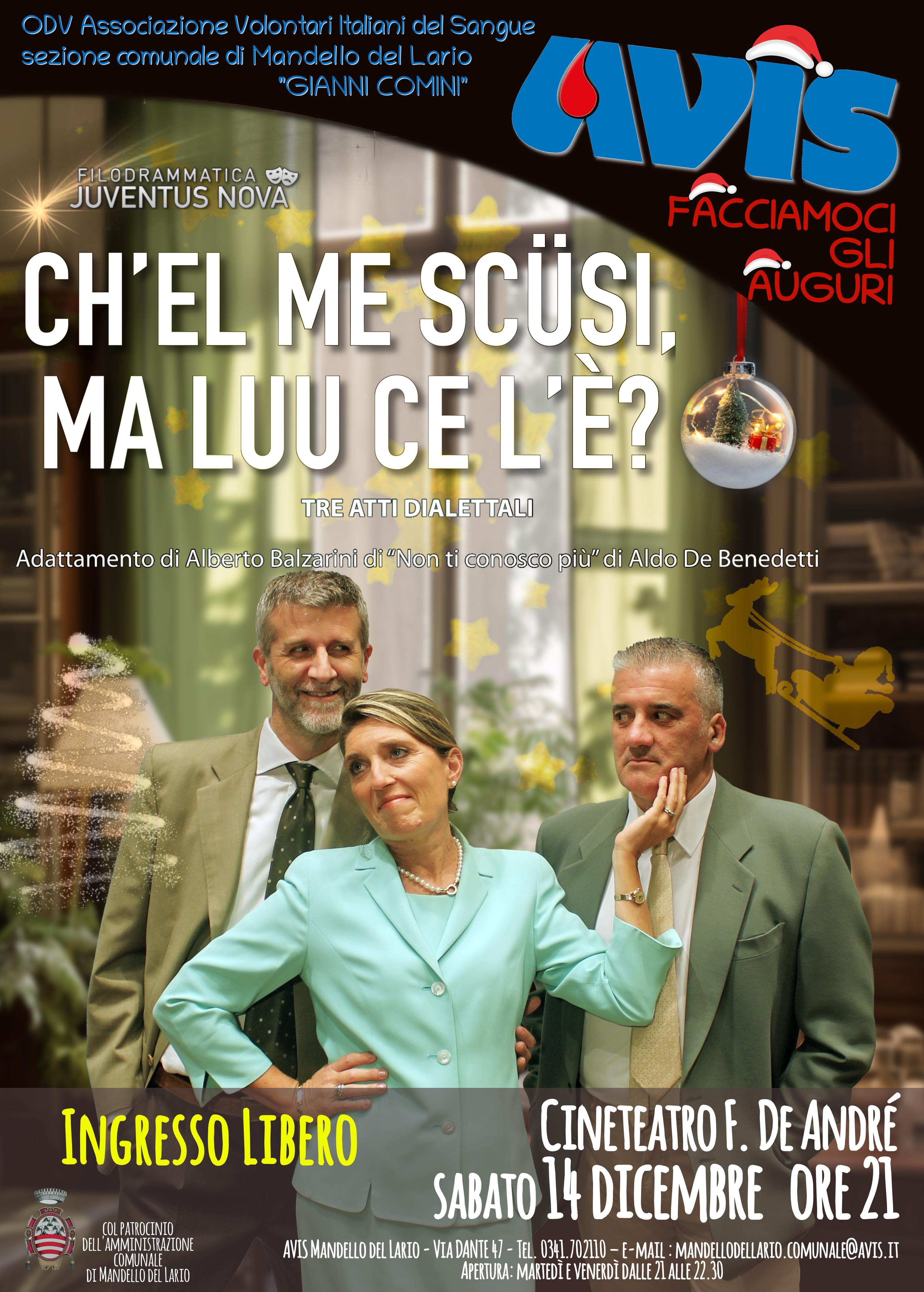ODV Associazione Volontari Italiani del Sangue sezione comunale di Mandello del Lario "Gianni Comini" vi invita al Teatro De André, sabato 14 dicembre alle ore 21.00 per assistere alla rappresentazione teatrale "EL ME SCUSI, MA LUU CE L’E’ ?", a cura della compagnia teatrale Juventus Nova di Lecco.