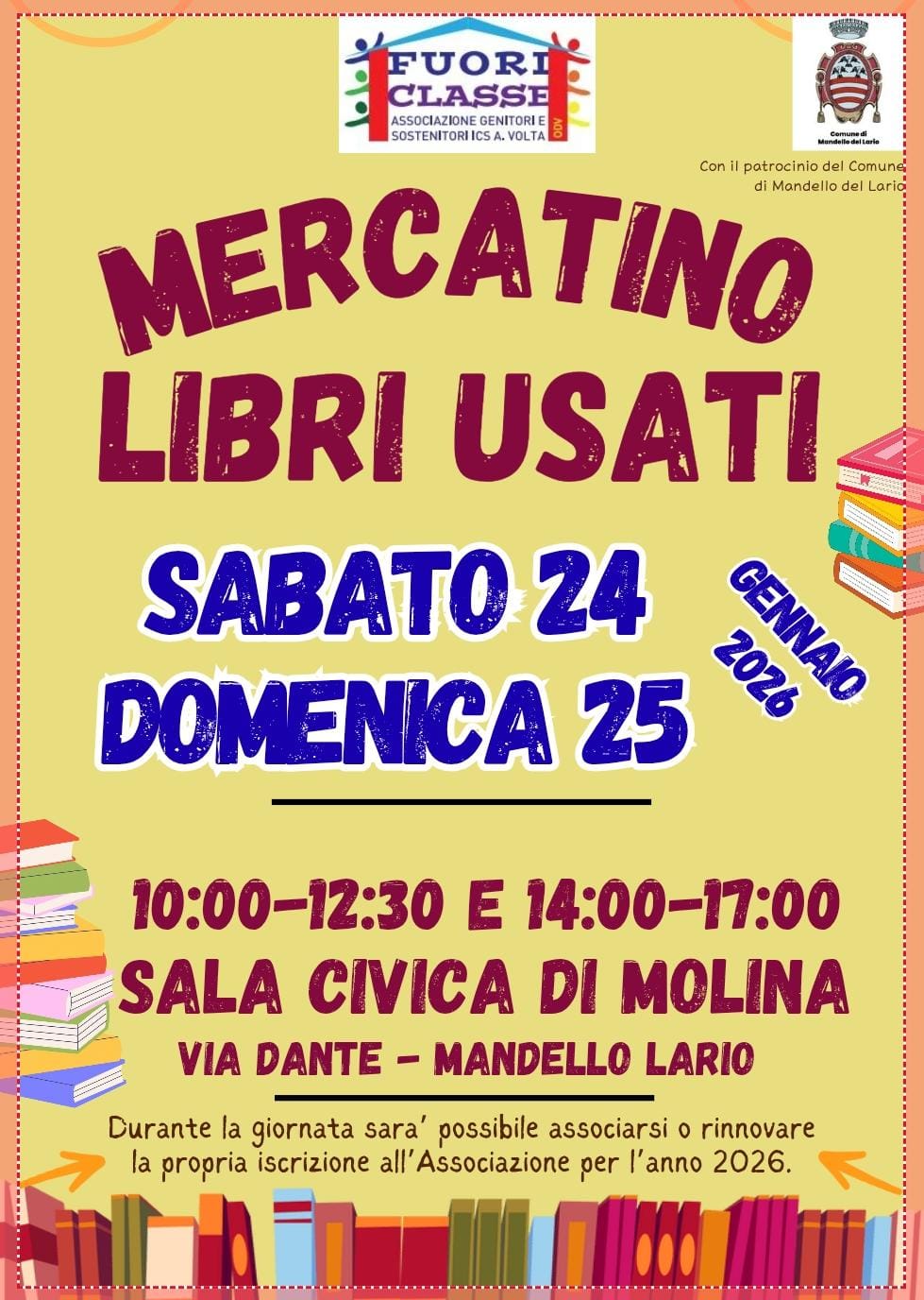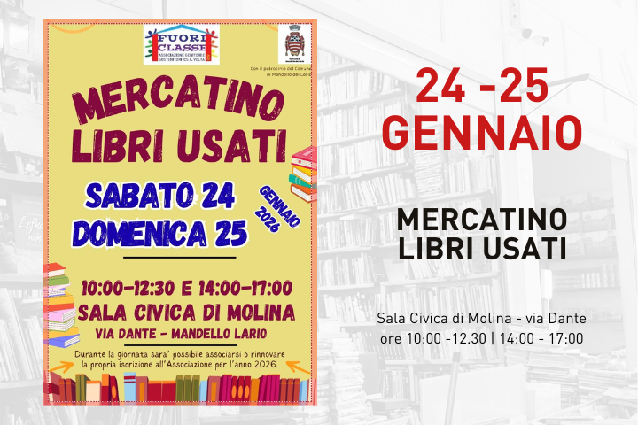 L'Associazione genitori e sostenitori ICS A. Volta Fuoriclasse, con il patrocinio del Comune di Mandello del Lario, organizza il Mercatino dei libri usati sabato 24 e domenica 25 gennaio presso la Sala Civica di Molina in via Dante 47.