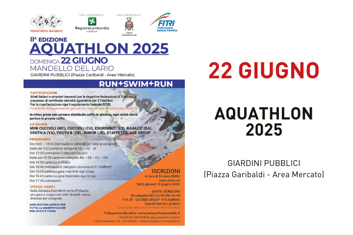 La Polisportiva Mandello del Lario, con il Patrocinio del Comune di Mandello del Lario, organizza per domenica 22 Giugno la 2nda edizione dell’Aquathlon di Mandello del Lario (Run + Swim + Run).