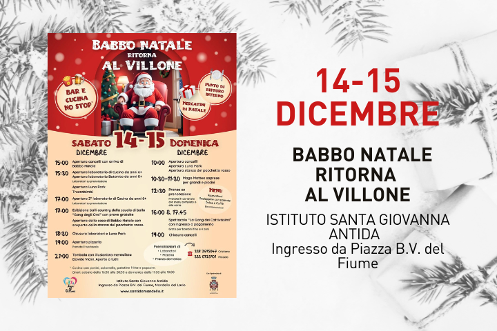 L'Istituto Santa Giovanna Antida, con il Patrocinio del Comune di Mandello del Lario, organizza sabato 14 e domenica 15 dicembre "Babbo Natale ritorna al Villone"