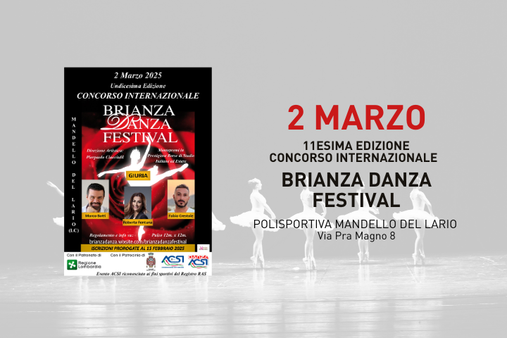 Domenica 2 marzo 2025 presso la Polisportiva Mandello del Lario si terrà l'11esima edizione del Concorso Internazionale di Danza "Brianza Danza Festival"