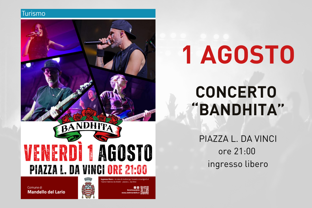 Venerdì 1 agosto, alle ore 21:00, Piazza Leonardo Da Vinci ospiterà il concerto della band Bandhita, che interpreterà i brani più iconici degli anni '90 fino ad oggi.