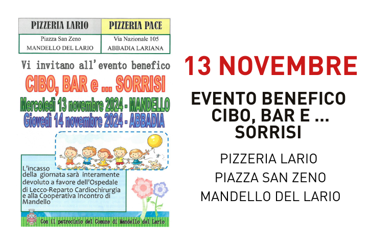 Pizzeria Lario (Piazza San Zeno Mandello del Lario) e Pizzeria Pace (Via Nazionale 105 Abbadia Lariana) vi invitano all'evento benefico CIBO, BAR e ... SORRISI
