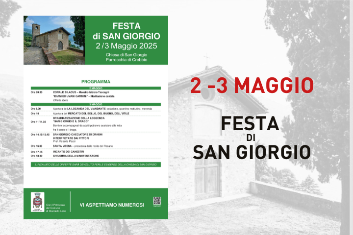 La Parrocchia di Crebbio, con il Patrocinio del Comune di Mandello del Lario, vi invita venerdì 2 e sabato 3 maggio alla Festa di San Giorgio.