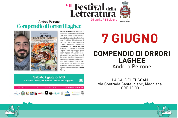 Andrea Peirone è il vincitore della VI edizione del Premio Internazionale di Letteratura Città di Como, con il racconto La Gabbia Dorata ed è finalista della VII edizione dello stesso con il racconto L’Uomo del Magnodeno. Entrambi i racconti sono inclusi nel Compendio di orrori Laghee. Il fantastico irrompe nel territorio del Lago di Como e punteggia questi luoghi di piccoli miti. L’autore ha stilato un breve compendio di orrori, di favole nere che si intrecciano con le sguaiate storie dei laghee. Sono presenti anche le leggende nere usate da Davide Van De Sfroos come ispirazione per le sue canzoni. Dialogherà con Andrea Peirone, Marino Nicoli.