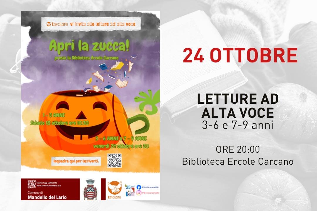 Venerdì 24 Ottobre 2025 alle ore 20.00 presso la Biblioteca Comunale Ercole Carcano, Via Manzoni 44/3 Mandello del Lario, si terranno le letture ad alta voce a cura del gruppo Favolare dedicate ai bambini della fascia d'età tra 3 e 6 anni e tra 7 e 9 anni, divisi in due gruppi.