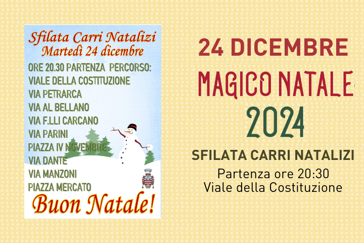 Torna la tradizionale SFILATA DEI CARRI NATALIZI con partenza alle 20.30 da Viale della Costituzione e arrivo in Piazza del Mercato dove il Gruppo A.N.A. distribuirà vin brulé e caldarroste