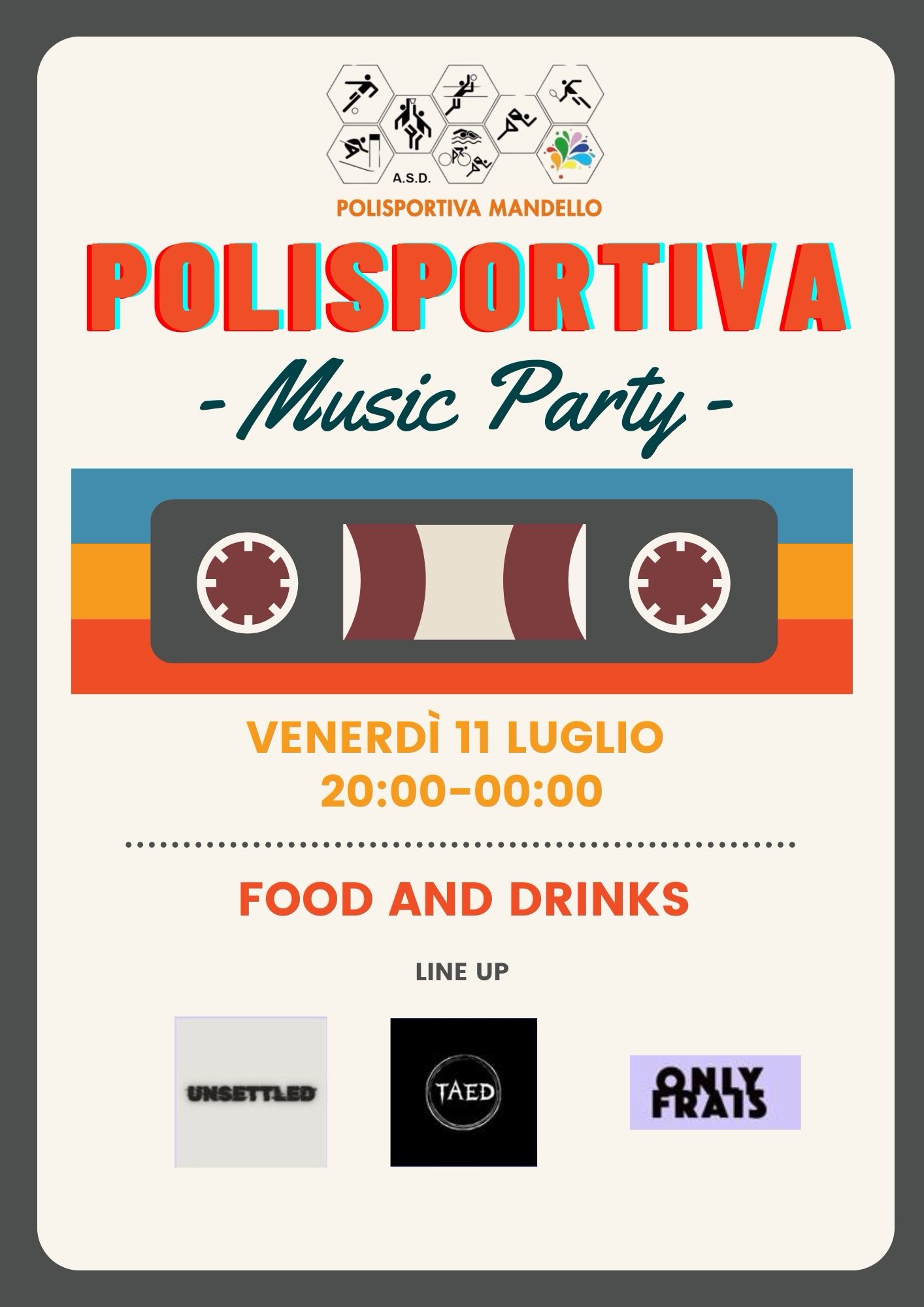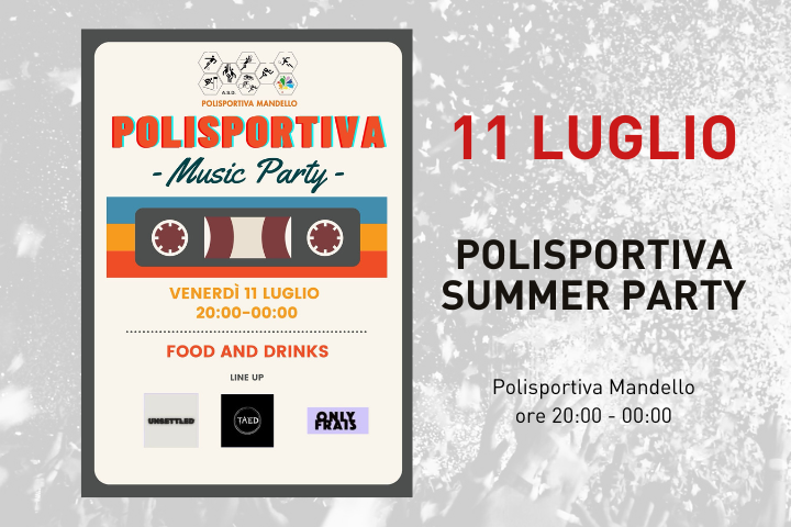 La Polisportiva Mandello presenta Music Party, venerdì 11 luglio, dalle ore 20:00 a mezzanotte, al Centro Sportivo Comunale di Pramagno.