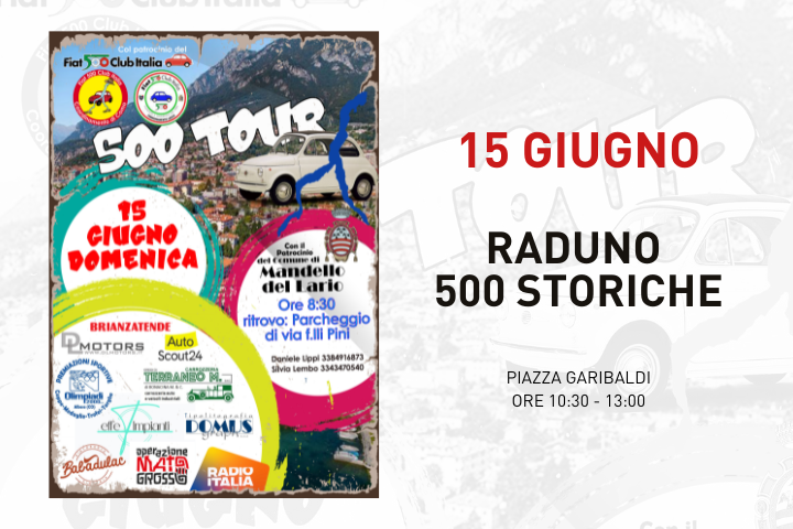 Il Fiat 500 Club Italia, con il patrocinio del Comune di Mandello del Lario, organizza per domenica 15 giugno, dalle ore 10:30 alle 13:00 circa, un raduno di Fiat 500 d’epoca.
