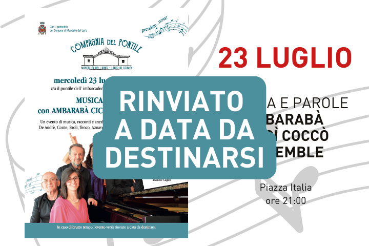La Compagnia del Pontile, con il Patrocinio del Comune di Mandello del Lario, vi invita al recital Musica e Parole con gli Ambaraba Ciccì Coccò Ensamble, mercoledì 23 alle ore 21:00 in piazza Italia.