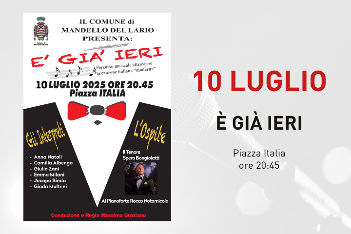 Giovedì 10 alle ore 20:45, in Piazza Italia, il Comune di Mandello del Lario presenta "è già ieri", un percorso musicale attraverso la canzone italiana moderna.