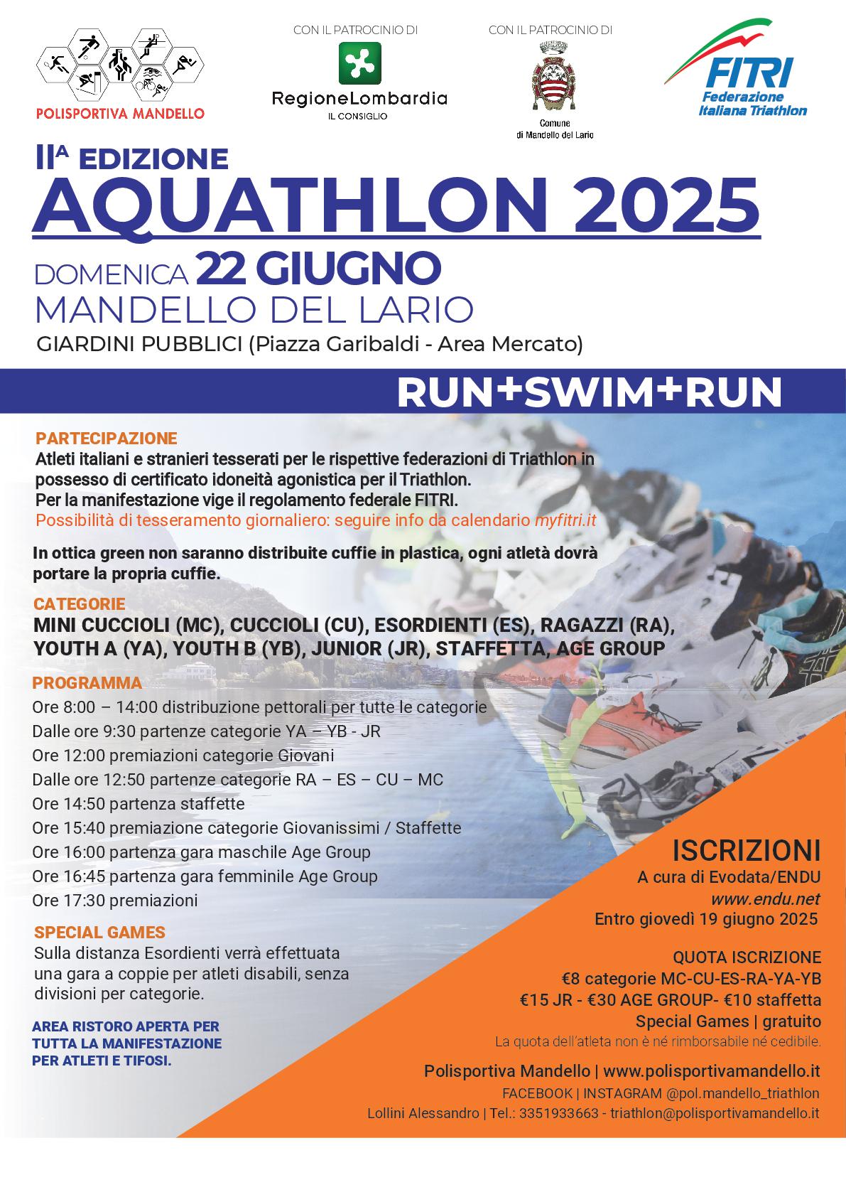 La Polisportiva Mandello del Lario, con il Patrocinio del Comune di Mandello del Lario, organizza per domenica 22 Giugno la 2nda edizione dell’Aquathlon di Mandello del Lario (Run + Swim + Run).