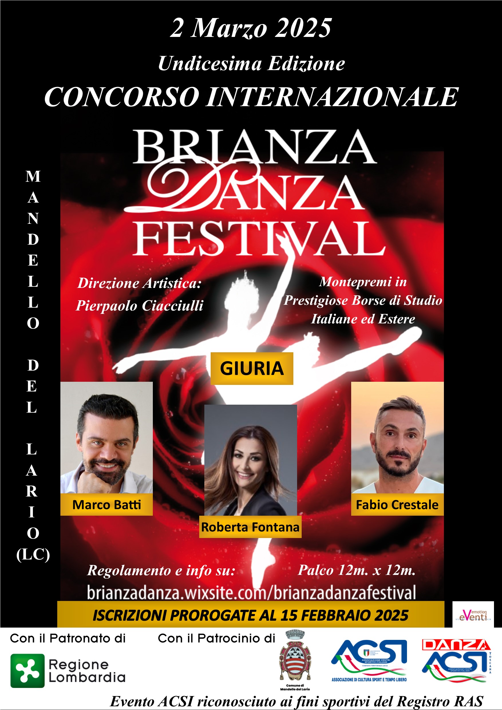 Domenica 2 marzo 2025 presso la Polisportiva Mandello del Lario si terrà l'11esima edizione del Concorso Internazionale di Danza "Brianza Danza Festival"