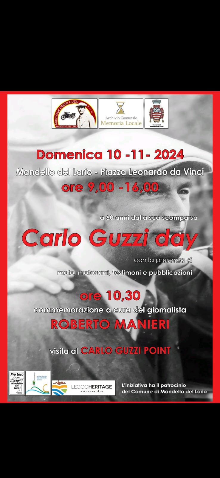 Il Moto Club Carlo Guzzi ASD, con il Patrocinio del Comune di Mandello del Lario, in occasione del 60° Anniversario della scomparsa di Carlo Guzzi organizza una commemorazione in Piazza L. da Vinci a Mandello del Lario.