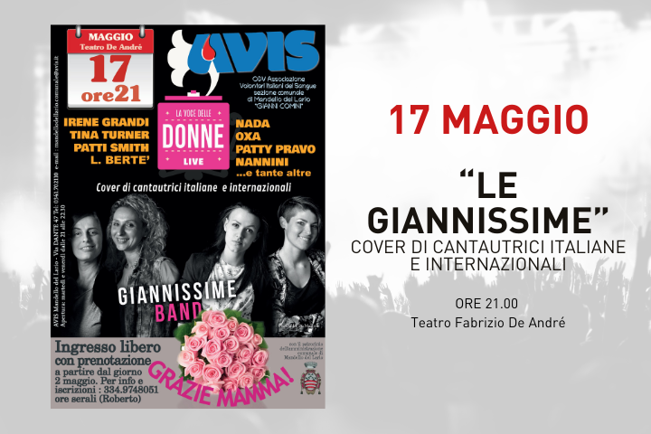 Avis Associazione Volontari Italiani del Sangue ODV Sezione Comunale di Mandello del Lario "Gianni Comini", con il Patrocinio del Comune di Mandello del Lario, in occasione della festa della mamma organizza il concerto "Le Giannissime"