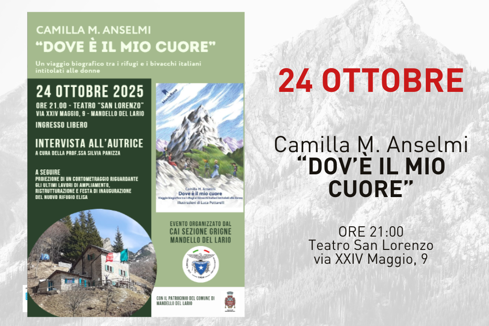 Il CAI sezione Grigne di Mandello del Lario, con il patrocinio del Comune di Mandello del Lario, organizza l'incontro con l'autrice Camilla M. Anselmi che venerdì 24 ottobre alle ore 21:00 presenterà "dov'è il mio cuore" - un viaggio biografico tra i rifugi e i bivacchi italiani intitolati alle donne.