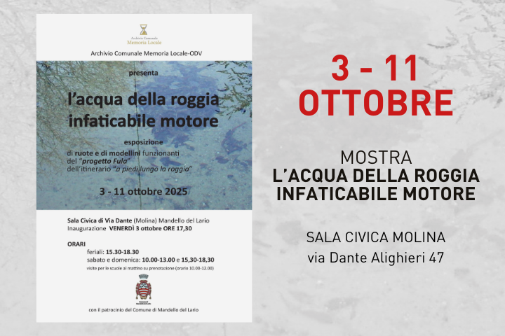 L'Archivio Comunale Memoria Locale - ODV, con il patrocinio del Comune di Mandello del Lario, organizza la mostra "L'acqua della Roggia infaticabile motore" - inaugurazione venerdì 3 ottobre alle ore 17:30.