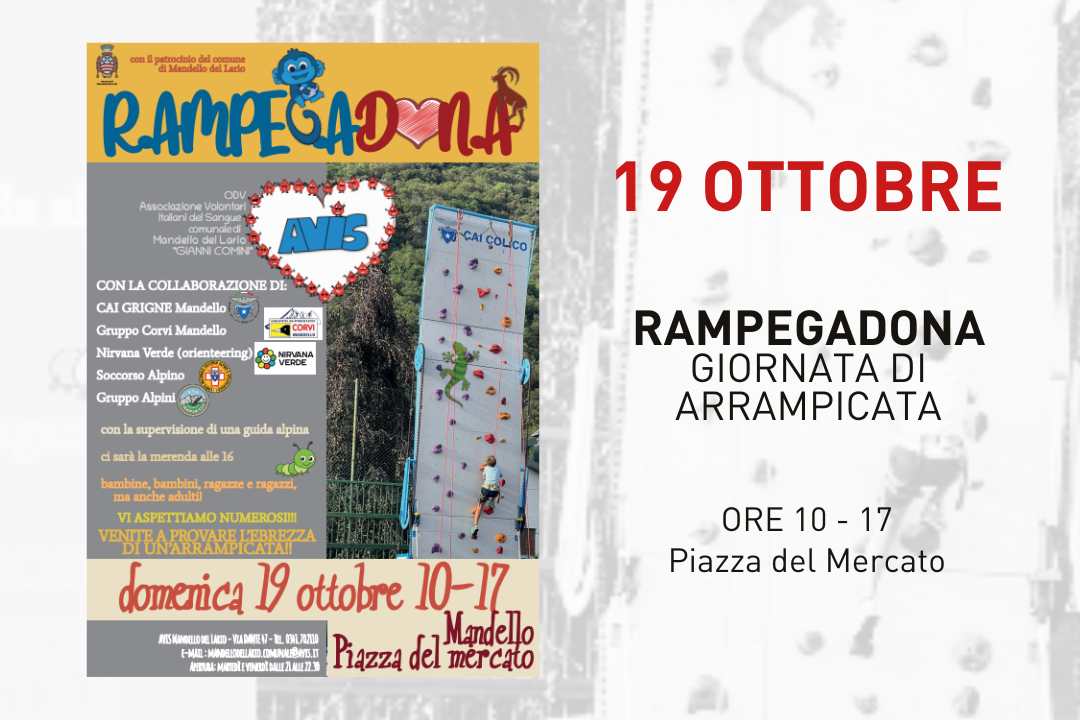L'AVIS comunale di Mandello del Lario "Gianni Comini", con il patrocinio del Comune di Mandello del Lario, organizza la Rampegadona, giornata di arrampicata aperta a bambine, bambini, ragazze e ragazzi, ma anche adulti. L’attività si svolgerà con la supervisione di una guida alpina qualificata.