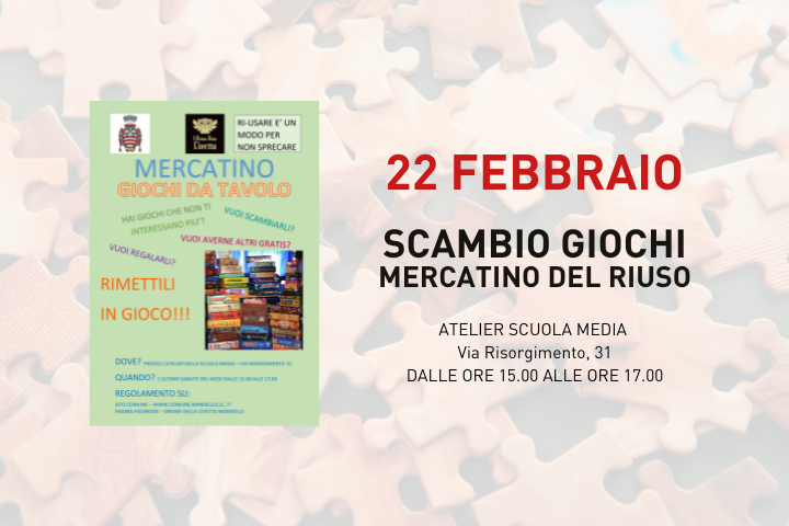 Sabato 22 febbraio 2025, come ogni ultimo sabato del mese, l'Assessorato alla Cultura e Istruzione del Comune di Mandello del Lario, in collaborazione con “L'Ordine della Civetta” come si definisce il gruppo di appassionati di giochi in scatola, vi aspetta per un altro appuntamento all'Atelier creativo per lo SCAMBIO GIOCHI "ri-usare è un modo per non sprecare".
