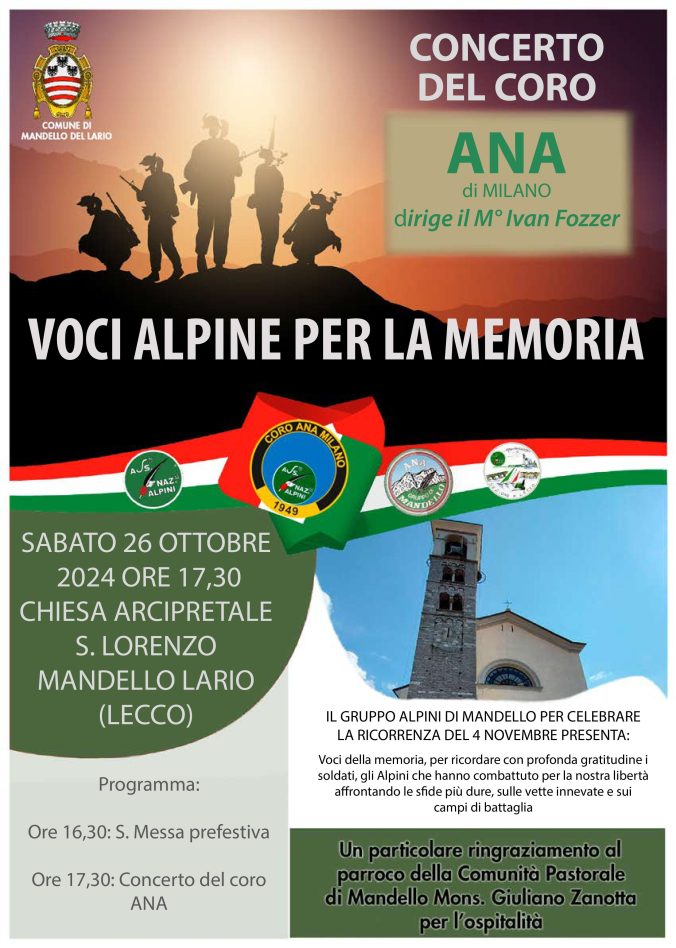 Sabato 26 ottobre 2024 alle ore 17.30 presso la Chiesa Arcipretale S. Lorenzo si terrà il concerto del coro ANA di Milano - dirige il Maestro Ivan Fozzer.