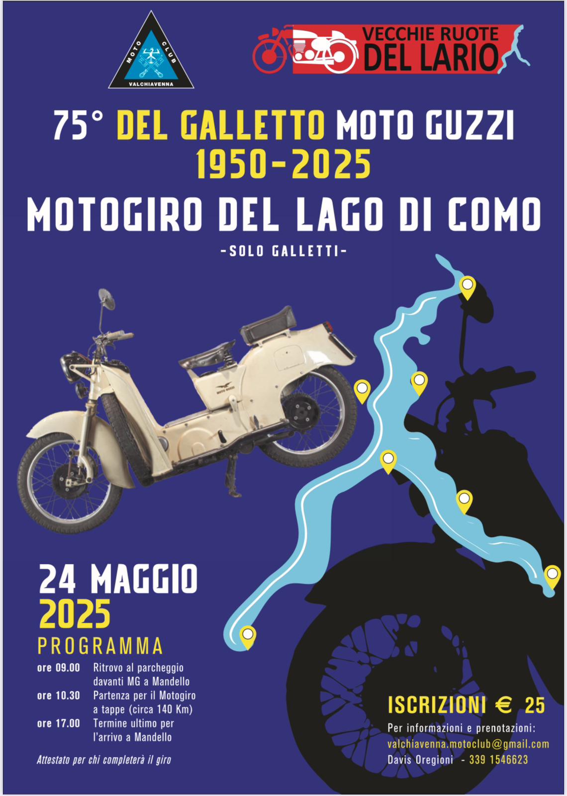 In occasione del 34° Raduno Internazionale del Galletto Moto Guzzi e anche nella ricorrenza dei suoi 75 anni dalla prima produzione (08/03/1950) il Club Vecchie Ruote del Lario in collaborazione con il Moto Club Valchiavenna organizza il Motogiro del Lago di Como - solo Galletti.