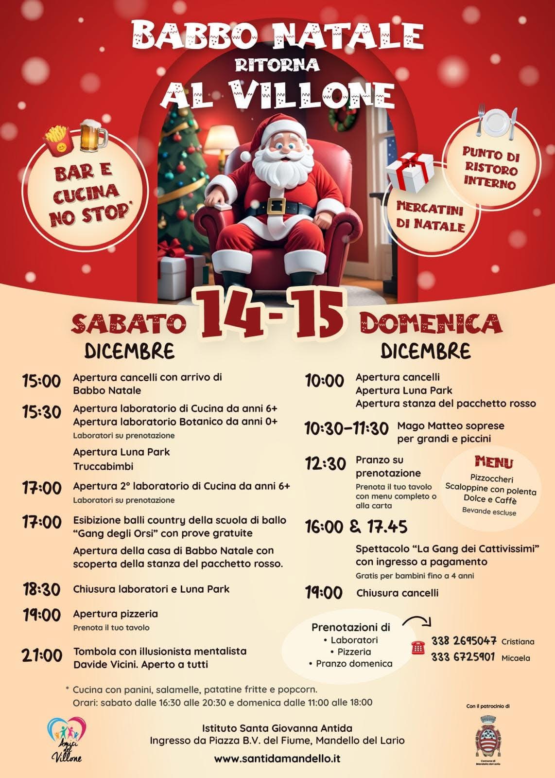 L'Istituto Santa Giovanna Antida, con il Patrocinio del Comune di Mandello del Lario, organizza sabato 14 e domenica 15 dicembre "Babbo Natale ritorna al Villone"