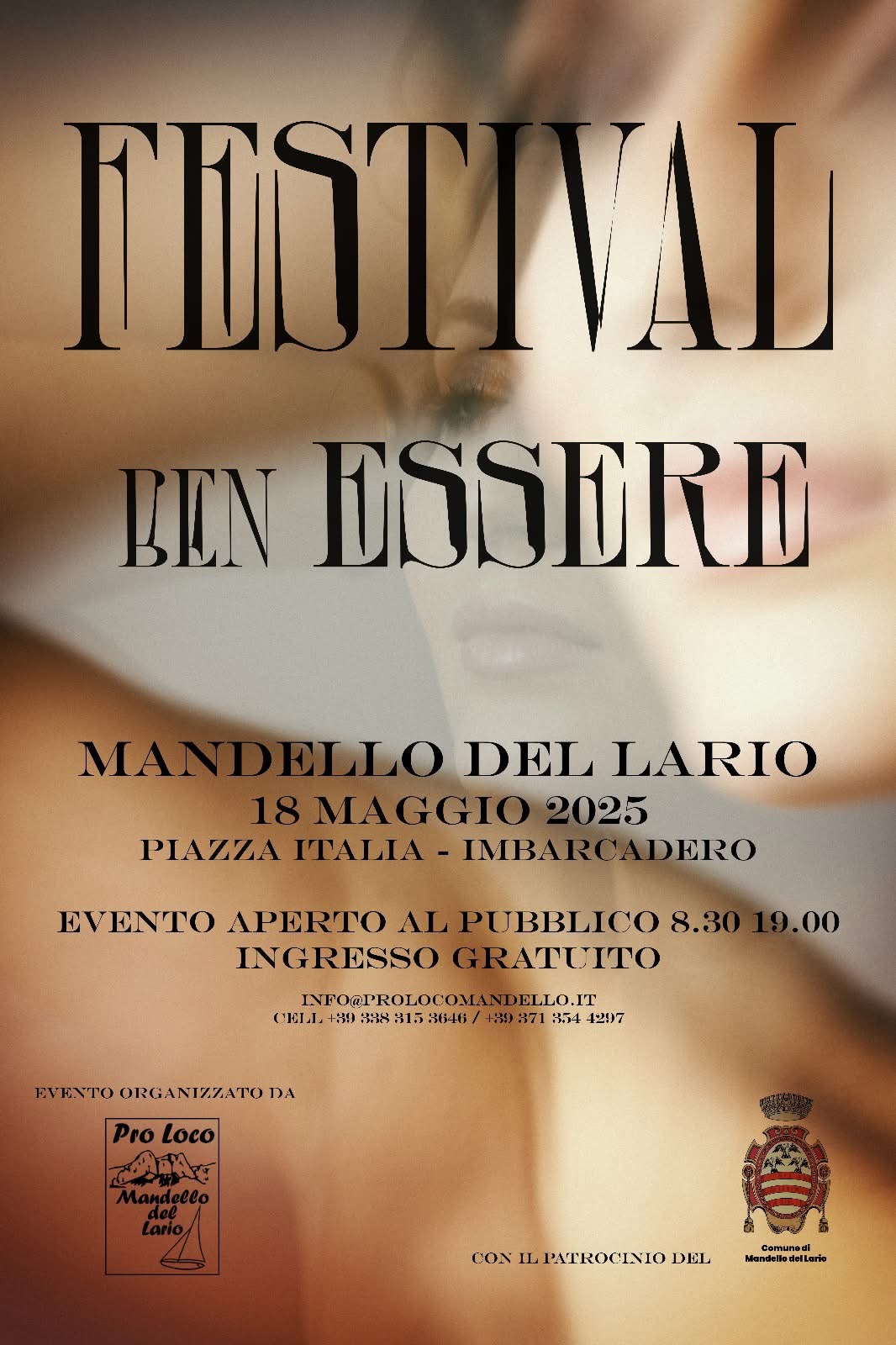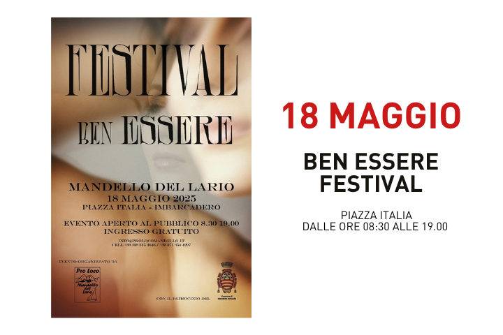 La Pro Loco Mandello, con il Patrocinio del Comune di Mandello del Lario, organizza l'evento Ben Essere Festival, domenica 18 maggio in Piazza Italia dalle ore 08.30 alle ore 19.00.