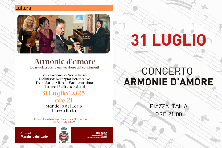 Il Comune di Mandello del Lario è lieto di presentare il concerto vocale e strumentale “Armonie d’amore: La musica come espressione dei sentimenti” che si svolgerà nella serata di Giovedì 31 Luglio alle ore 21.00 in Piazza Italia.