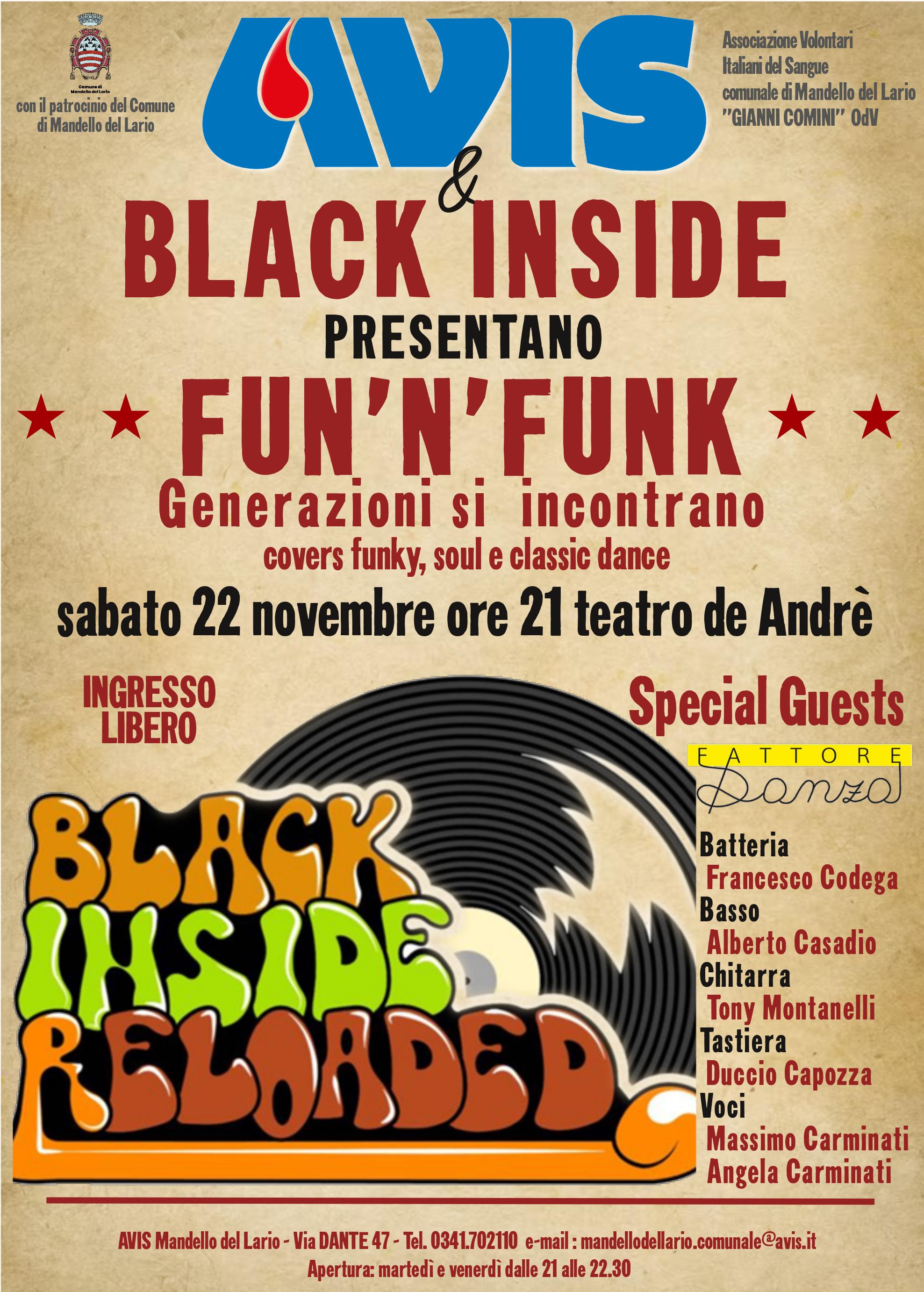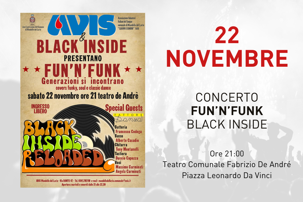 L'Associazione Volontari Italiani del Sangue comunale di Mandello del Lario "Gianni Comini" ODV, con il patrocinio del Comune di Mandello del Lario, organizza il concerto "Fun' n' Funk - generazioni si incontrano". Cover funky, soul e classic dance sabato 22 novembre alle ore 21:00 al teatro comunale Fabrizio De André.