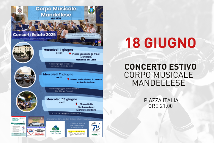 Anche quest'estate il Corpo Musicale Mandellese, con il patrocinio del Comune di Mandello del Lario, propone una serie di concerti all'aperto, per condividere con il pubblico il piacere della musica e dell'incontro.