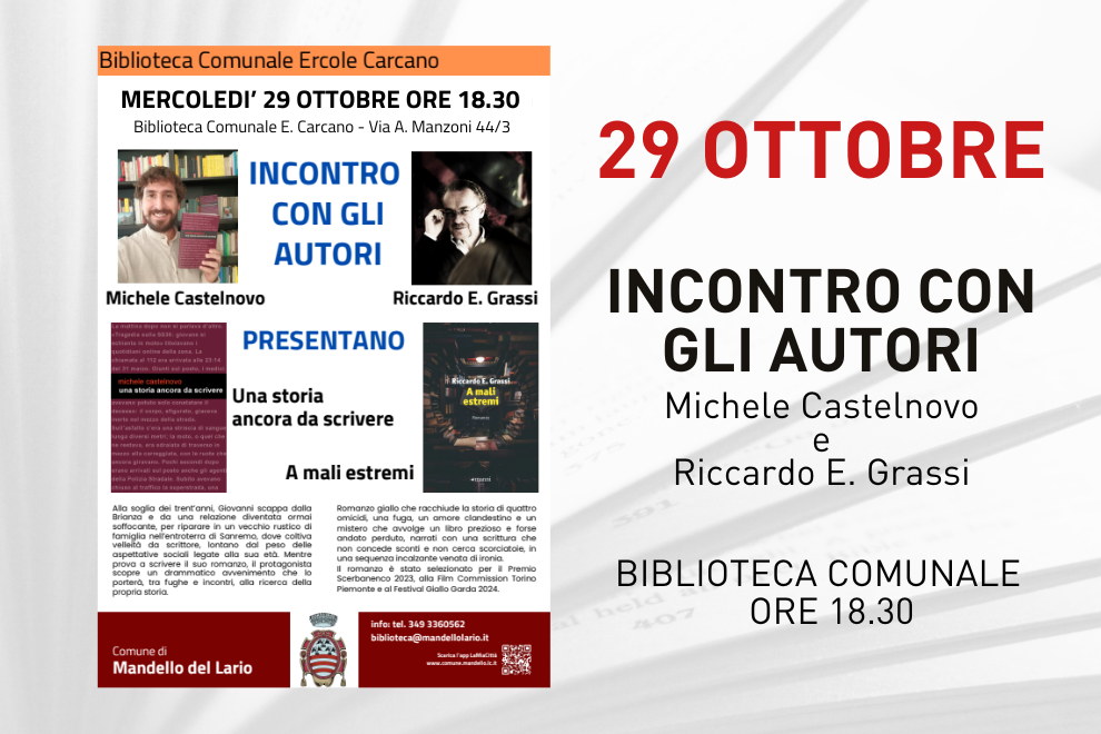 Nuovo incontro con gli autori alla Biblioteca Comunale Ercole Carcano mercoledì 29 ottobre alle ore 18.30. Gli scrittori Michele Castelnovo e Riccardo Grassi saranno ospiti a Mandello per un nuovo appuntamento organizzato dall’Amministrazione Comunale.