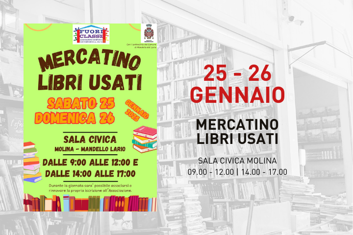 L'Associazione genitori e sostenitori ICS A. Volta Fuoriclasse, con il patrocinio del Comune di Mandello del Lario, organizza il Mercatino dei libri usati presso la Sala Civica a Molina.