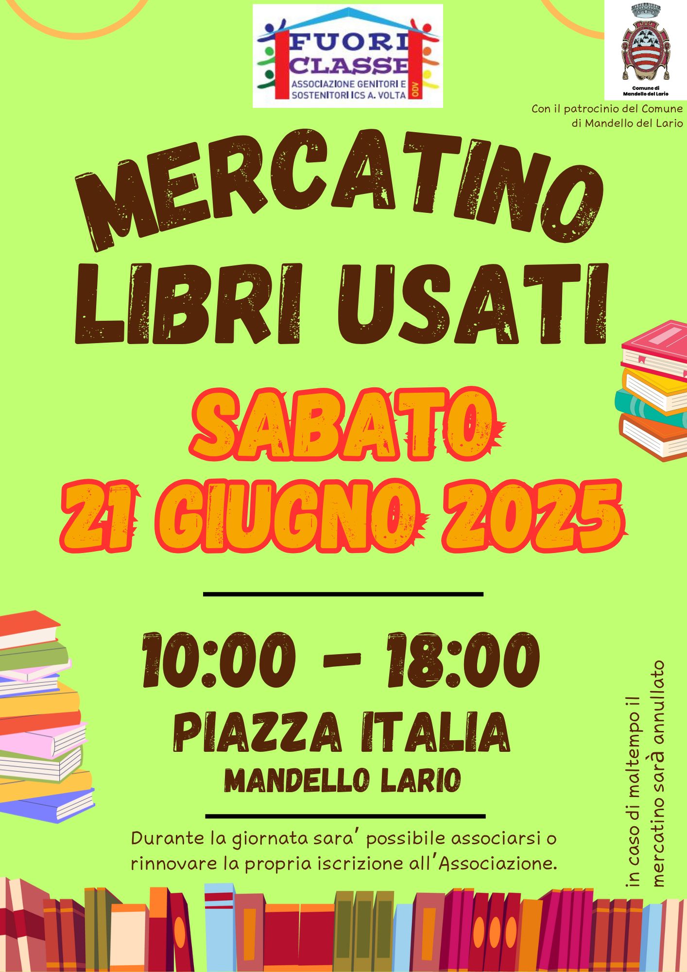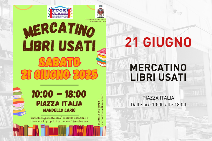 L'Associazione genitori e sostenitori ICS A. Volta Fuoriclasse, con il patrocinio del Comune di Mandello del Lario, organizza il Mercatino dei libri usati in Piazza Italia