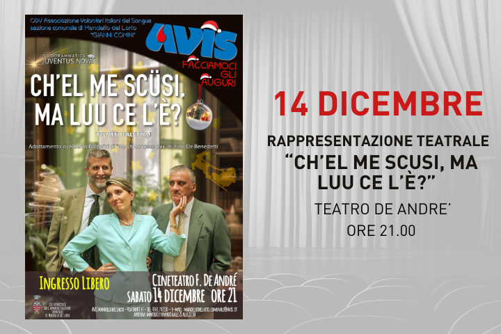 ODV Associazione Volontari Italiani del Sangue sezione comunale di Mandello del Lario "Gianni Comini" vi invita al Teatro De André, sabato 14 dicembre alle ore 21.00 per assistere alla rappresentazione teatrale "EL ME SCUSI, MA LUU CE L’E’ ?", a cura della compagnia teatrale Juventus Nova di Lecco.