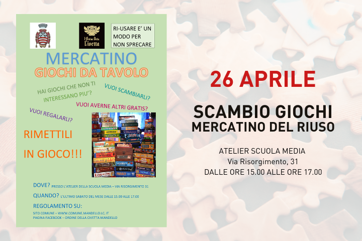 Sabato 26 aprile torna l'appuntamento all'Atelier creativo per lo SCAMBIO GIOCHI "ri-usare è un modo per non sprecare".