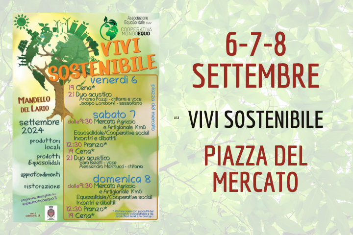 vi aspettano in Piazza del Mercato per Vivi Sostenibile 2024 con produttori locali, prodotti Equosolidali, approfondimenti e ristorazione.