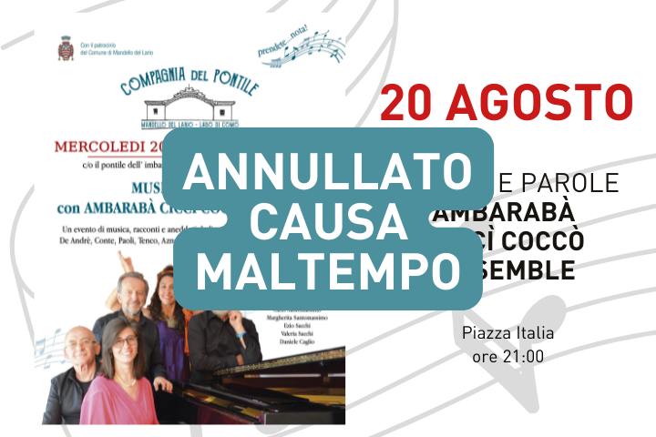 La Compagnia del Pontile, con il Patrocinio del Comune di Mandello del Lario, vi invita al recital Musica e Parole con gli Ambaraba Ciccì Coccò Ensamble, mercoledì 20 agosto alle ore 21:00 in piazza Italia, in recupero della serata prevista lo scorso 23 luglio.