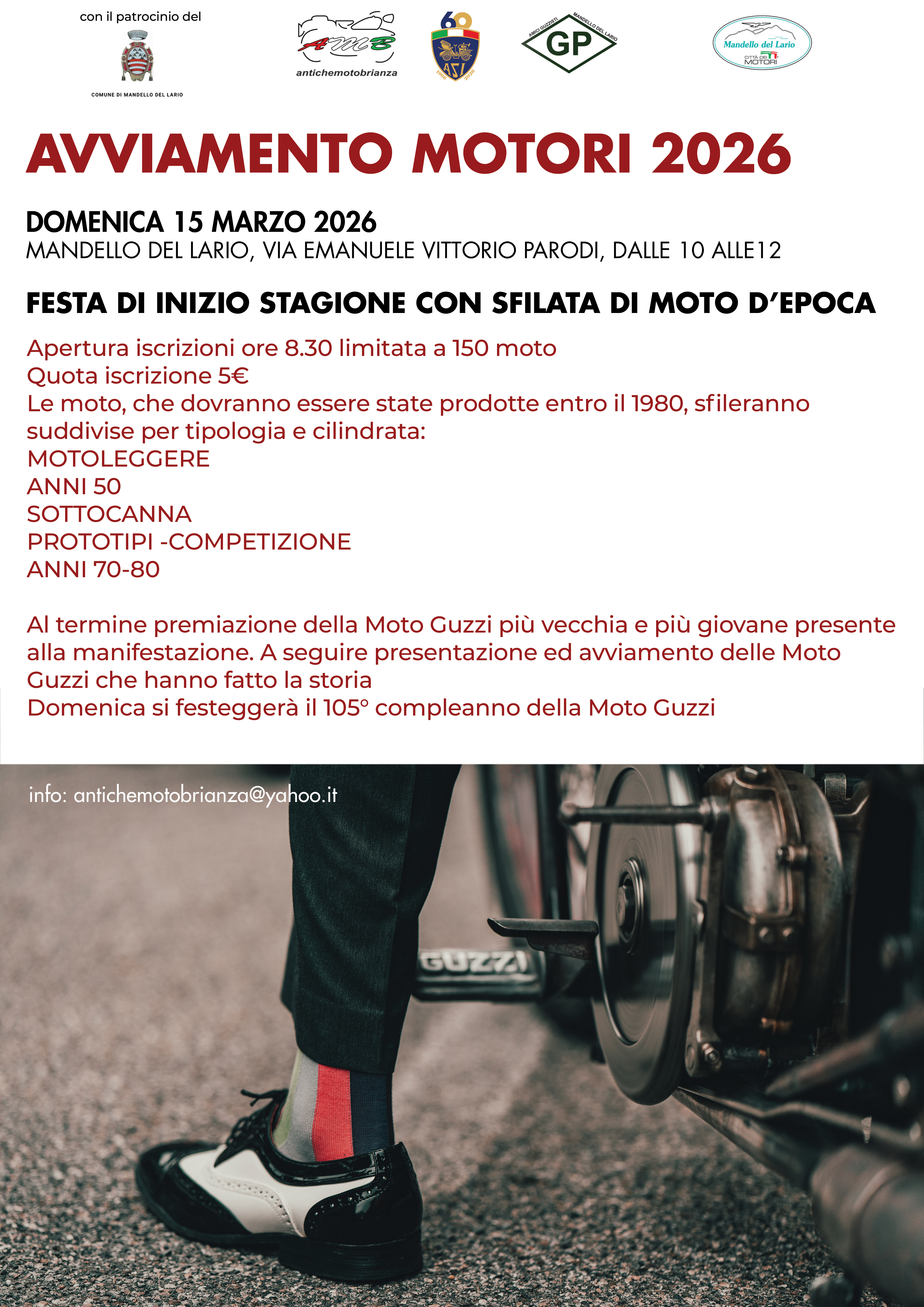 L'Associazione Antiche Moto Brianza, con il patrocinio del Comune di Mandello del Lario, organizzano per domenica 15 marzo la festa di inizio stagione con sfilata di moto d'epoca Avviamento Motori 2026.