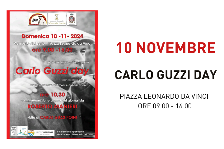 Il Moto Club Carlo Guzzi ASD, con il Patrocinio del Comune di Mandello del Lario, in occasione del 60° Anniversario della scomparsa di Carlo Guzzi organizza una commemorazione in Piazza L. da Vinci a Mandello del Lario.