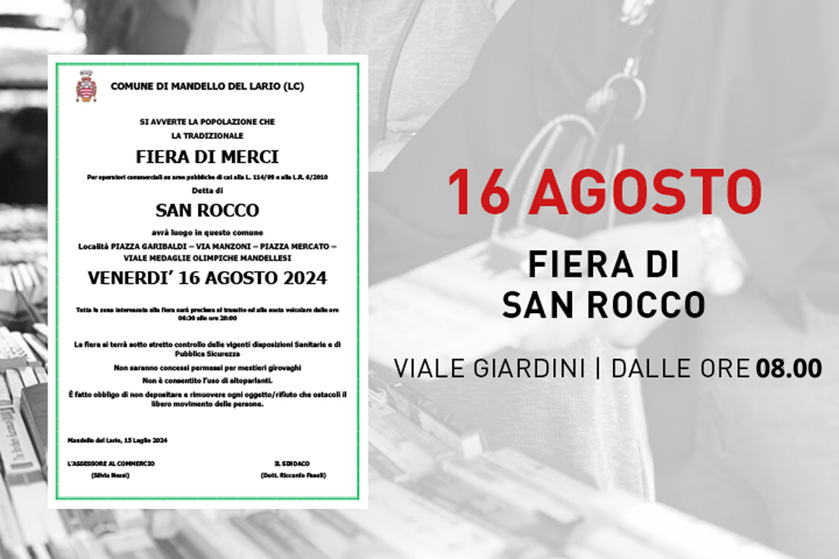 La tradizionale fiera di San Rocco avrà luogo in località piazza Garibaldi – via Manzoni – piazza Mercato – viale Medaglie Olimpiche Mandellesi venerdì 16 agosto 2024 dalle ore 08.00 alle 18.00.