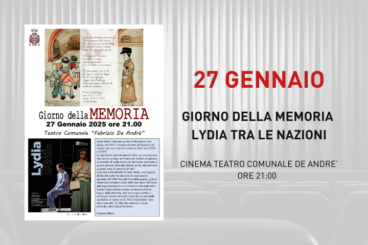 Lunedì 27 gennaio 2025, alle ore 21:00, presso il Teatro Comunale 'Fabrizio De André', si terrà lo spettacolo di Lydia Gelmi Cattaneo, in occasione del Giorno della Memoria.