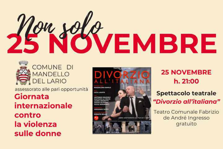 In occasione della Giornata Internazionale contro la Violenza sulle Donne l'Assessorato alle Pari Opportunità organizza presso il Teatro Comunale Fabrizio De André lo spettacolo teatrale "Divorzio all'italiana"