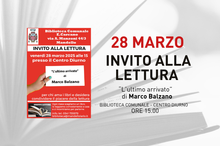 Per chi ama i libri e desidera condividere il piacere della lettura, la Biblioteca Comunale invita a partecipare al gruppo di lettura dedicato a "L'ultimo arrivato" di Marco Balzano.