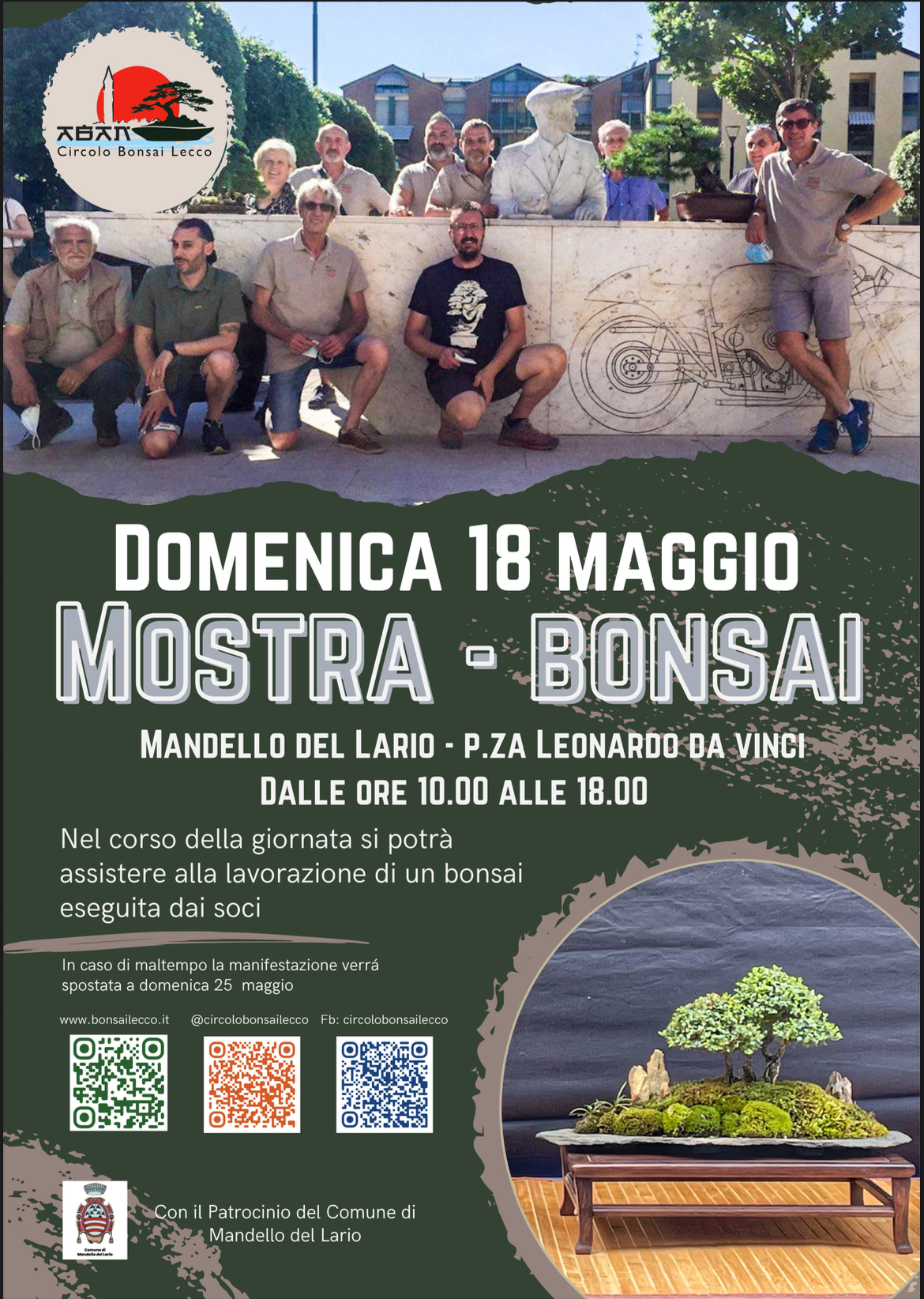 L'Associazione Bonsai Arte Natura Lecco, con il Patrocinio del Comune di Mandello del Lario, organizza per il 5° anno la Mostra Bonsai, domenica 18 maggio dalle ore 10 alle ore 18 in Piazza Leonardo Da Vinci.